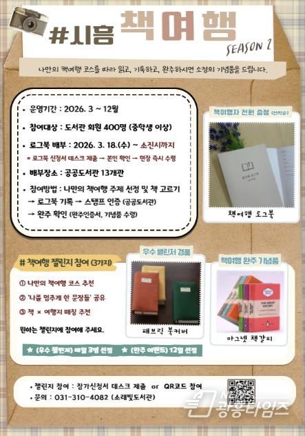 [광흥타임즈 = 조수제 기자] 시흥시도서관은 시민의 독서 실천을 지원하고 일상 속 독서문화를 확산하기 위해 3월 18일부터 ‘2026 시흥 책여행(시즌2)’ 로그북을 배부하고, ‘책여행 로그북 챌린지’를 함께 운영한다.