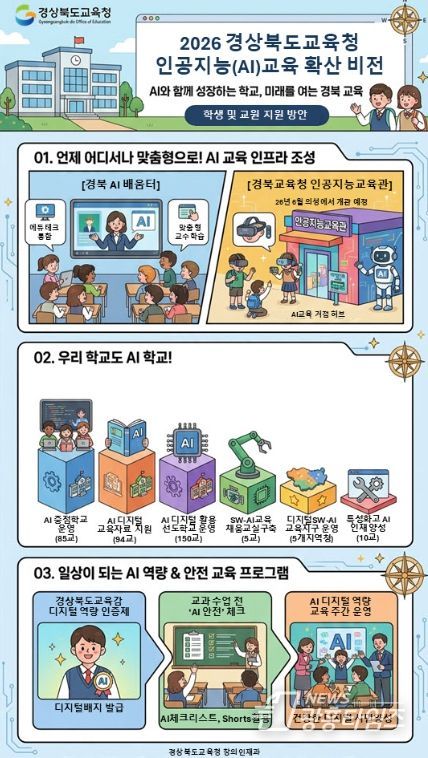 [광흥타임즈 = 조수제 기자] 경북교육청은 ‘AI와 동행하는 따뜻한 경북교육’을 비전으로 다가오는 인공지능 시대를 주도할 미래 인재 양성을 위해 ‘2026 AI(인공지능)교육 종합계획’을 수립해 본격 추진한다고 18일 밝혔다.