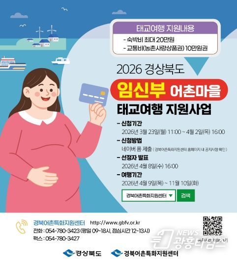 [광흥타임즈 = 조수제 기자] 경상북도는 저출생 문제를 해결하고 어촌지역 활성화를 위하여 3월 23일부터‘임신부 어촌마을 태교여행’모집을 실시한다고 밝혔다.