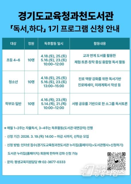 [광흥타임즈 = 조수제 기자] 경기도교육청과천도서관이 지역주민의 독서 역량 강화와 융합적 사고력 함양을 위해 '2026년 독서, 하다’프로그램을 운영한다.