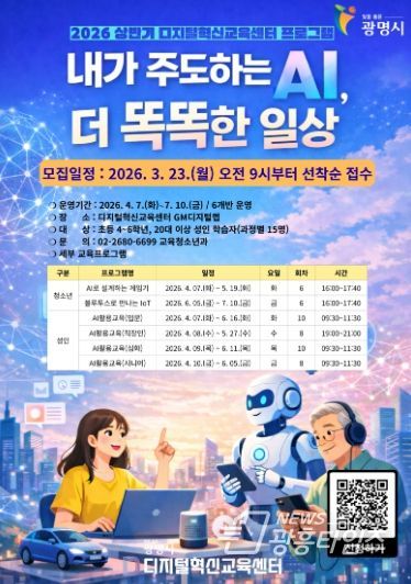 [광흥타임즈 = 조수제 기자] 광명시 디지털혁신교육센터가 시민들의 디지털 역량 강화를 위해 오는 23일부터 ‘2026년 상반기 맞춤형 디지털 교육’ 수강생을 선착순 모집한다.