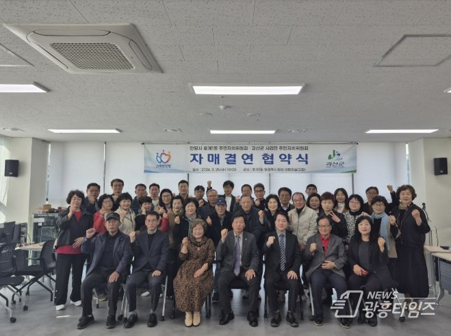 [광흥타임즈 = 조수제 기자] 안양시 동안구 호계1동 주민자치위원회는 지난 25일 호계1동 행정복지센터에서 충북 괴산군 사리면 주민자치위원회와 상생 발전 및 도농 교류 활성화를 위한 자매결연 협약을 체결했다.