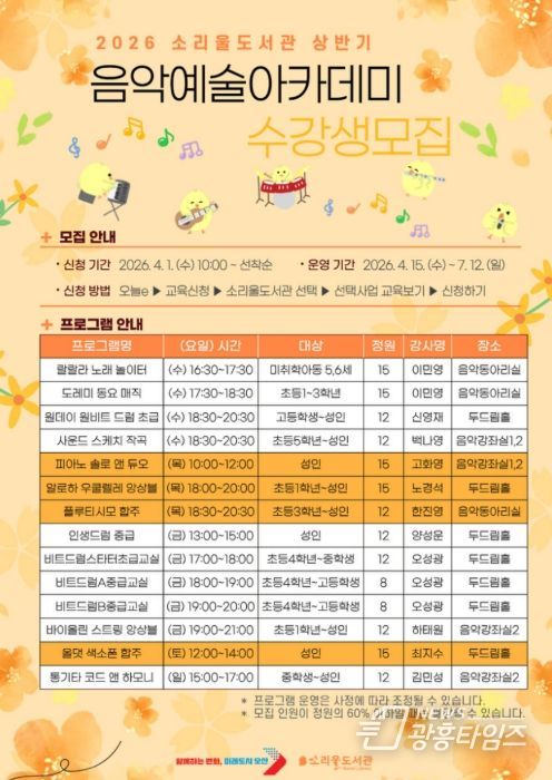 [광흥타임즈 = 조수제 기자] 오산시 소리울도서관은 시민들의 예술적 감수성을 높이고 일상 속 음악 문화를 확산하기 위해 ‘2026년 소리울도서관 상반기 음악예술아카데미’ 수강생을 모집한다고 밝혔다.