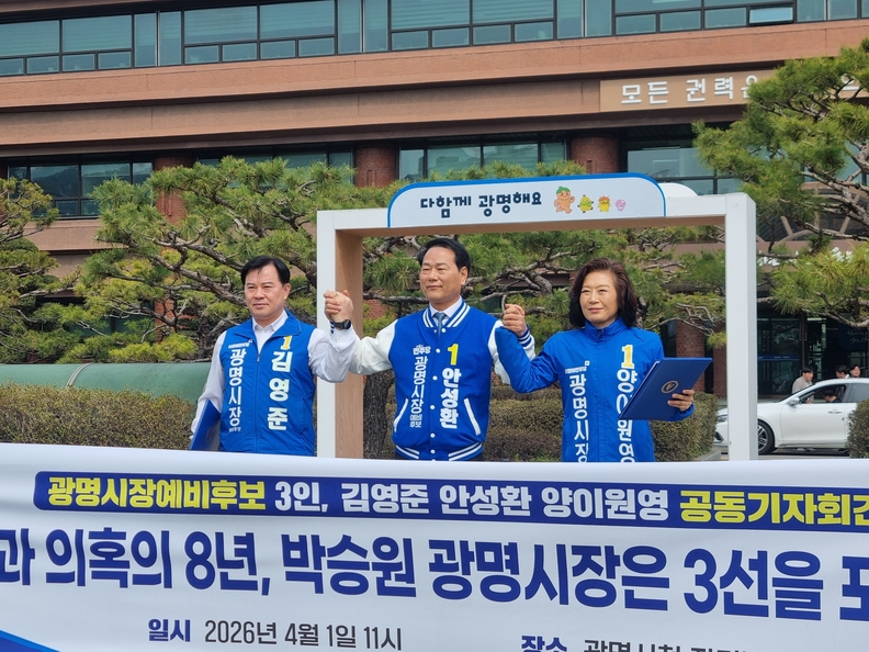 [광흥타임즈 = 조수제 기자]1일 오전 11시 경기 광명시청 잔디광장에서 더불어민주당 소속 광명시장 예비후보 3인이 현직 박승원 시장을 강하게 비판하며 3선 도전 포기를 공개적으로 촉구했다.
