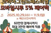 [광흥타임즈 = 조수제 기자] 시흥시는 오는 10월 29일부터 11월 9일까지 12일간 정부가 추진하는 ‘코리아 그랜드 페스티벌’에 참여해 시흥화폐 ‘시루’ 모바일결제 시 5%를 돌려주는 환급행사인 페이백을 진행한다. 이를 통해 시민들의 소비를 촉진하고 지역경제에 활력을 불어넣을 계획이다. ‘코리아 그랜드 페스티벌’은 ‘희망이 되는 소비, 함께 성장하는 경제’를 슬로건으로 내걸고, 가을소비 진작을 위해 범국가적으로 추진되는 대한민국 최대 규모의 할인 축제이자 국가통합 소비 활성화 프로젝트다. 행사 기간, 시흥시는 예산 소진 시까지 시흥화폐 60만 원 결제 한도 내에서 5% 페이백을 제공해 최대 3만 원까지 혜택받을 수 있도록 지원한다. 페이백 내역은 모바일 시루 앱에서 실시간으로 확인할 수 있다. 정호기 시흥시 경제국장은 “이번 페이백 행사를 통해 시흥화폐 시루의 활성화를 도모하고, 시민들이 즐겁게 지역 경제 활성화에 참여할 수 있는 계기가 되길 바란다”라고 말했다.